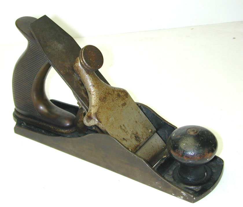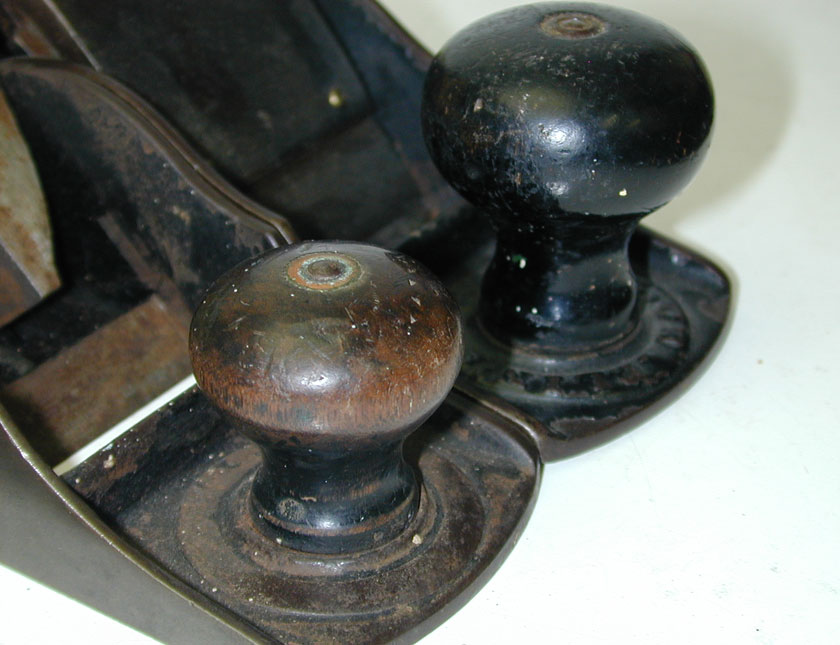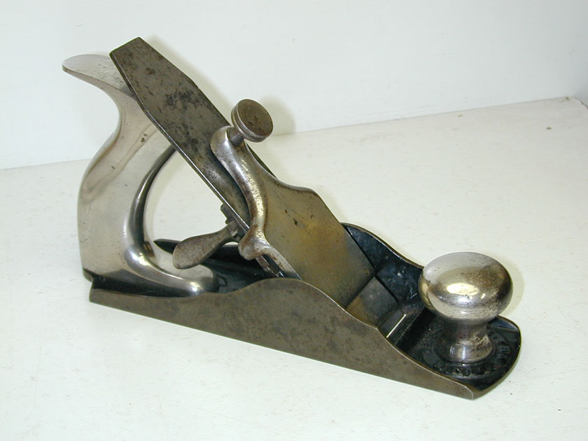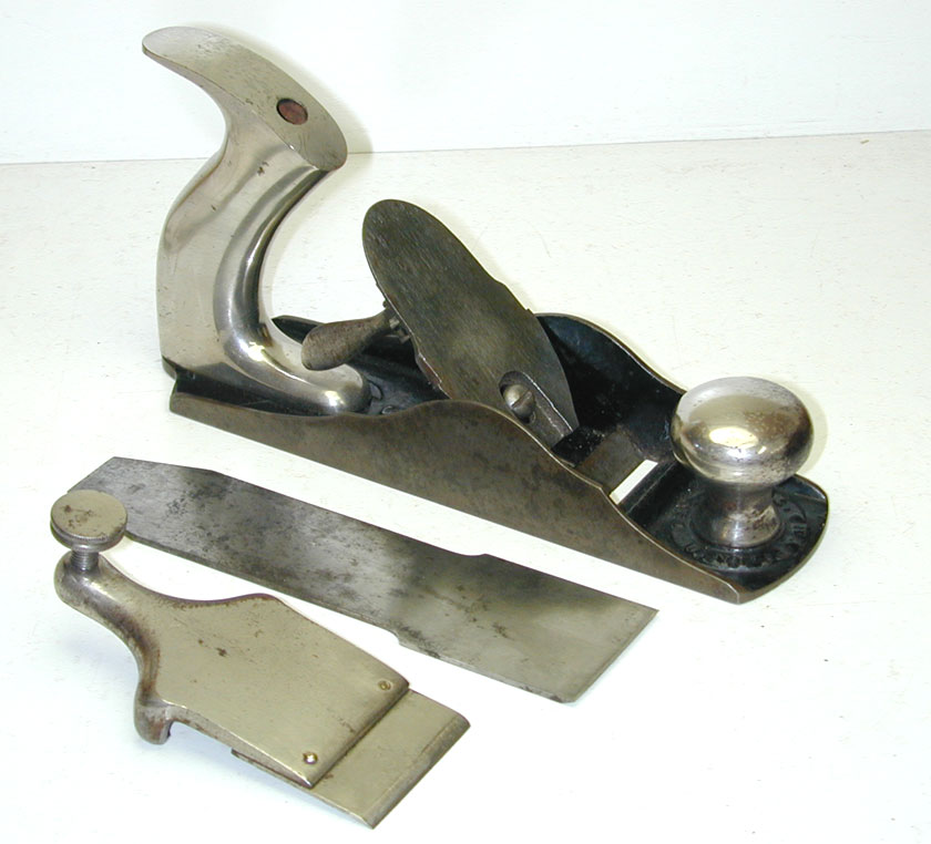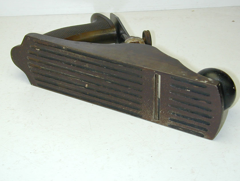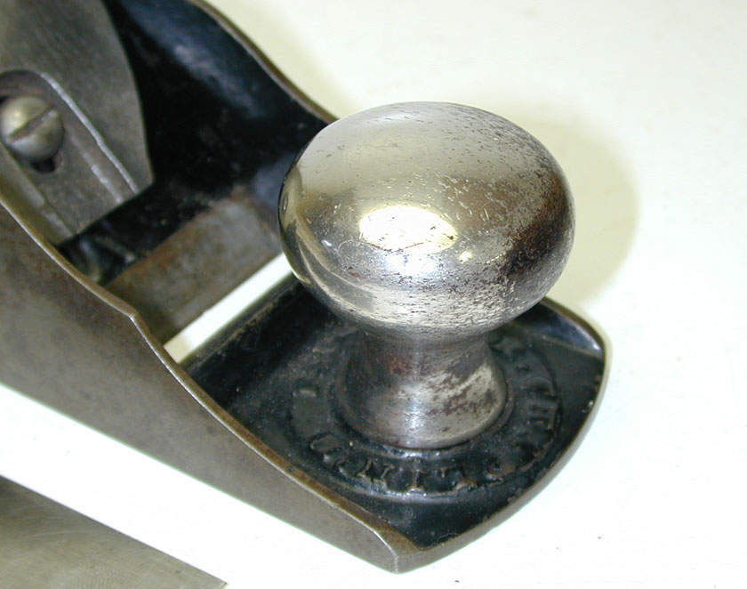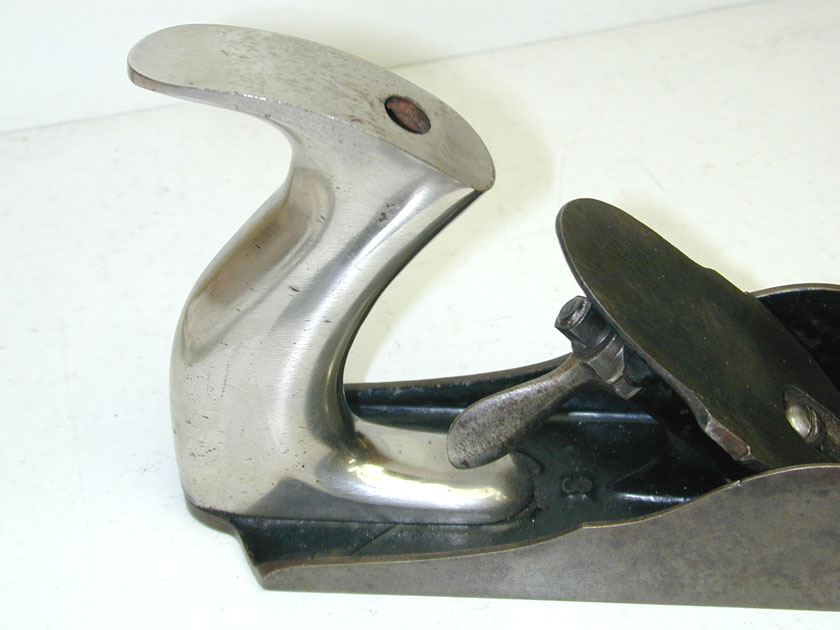 #203 This plane has a smooth rubber handle in the shape of the iron handle with a longer horn, and a small wooden knob with Chaplin's Patent machined away from the body around the knob. Blade looks like a replacement from a wooden body plane #72 or #73 and the lever has a brass rivet in the middle, fitted later.