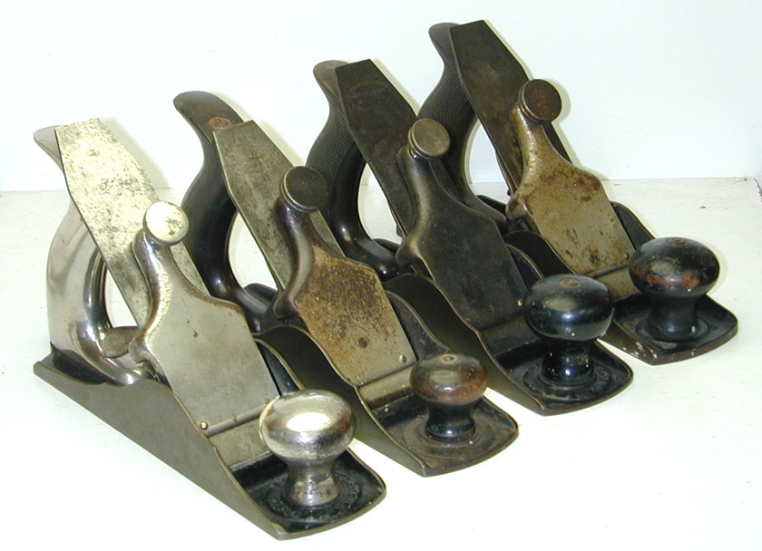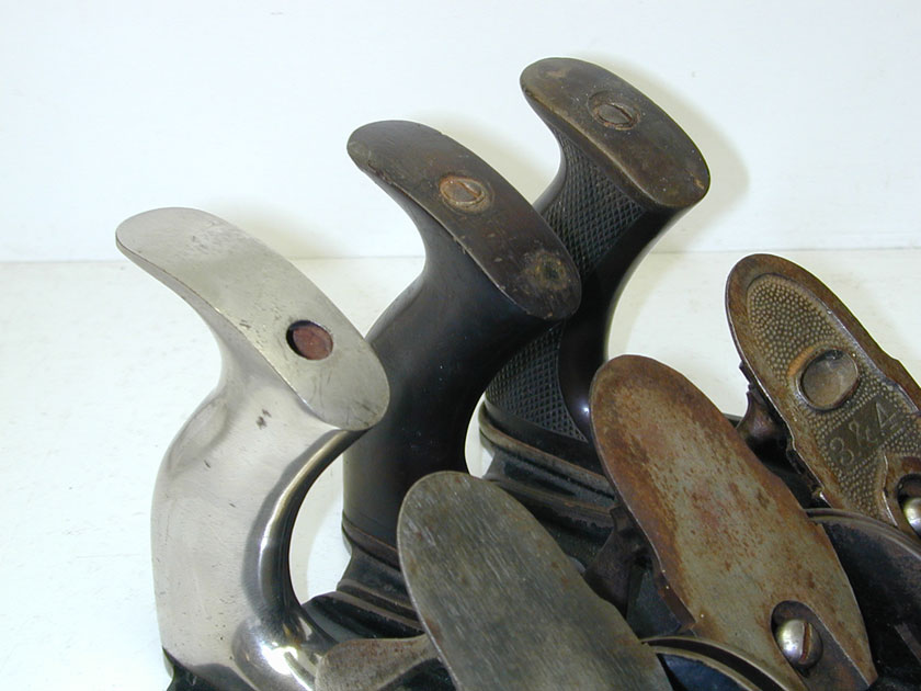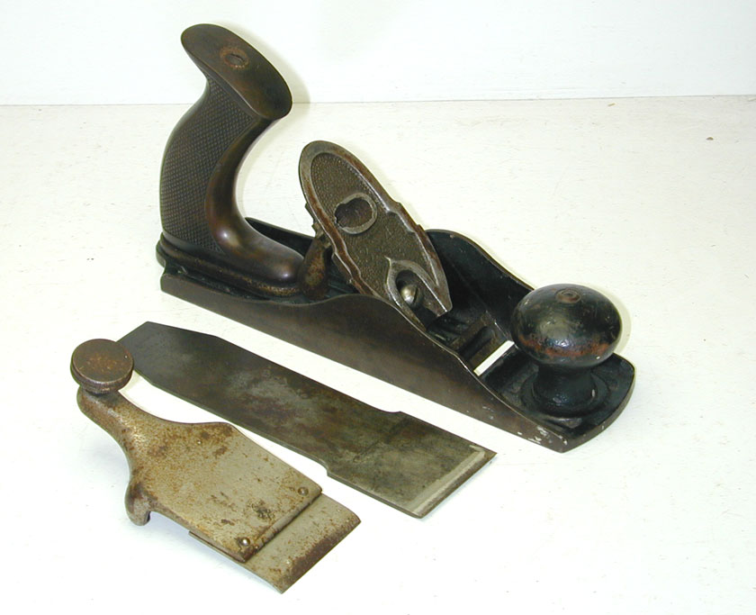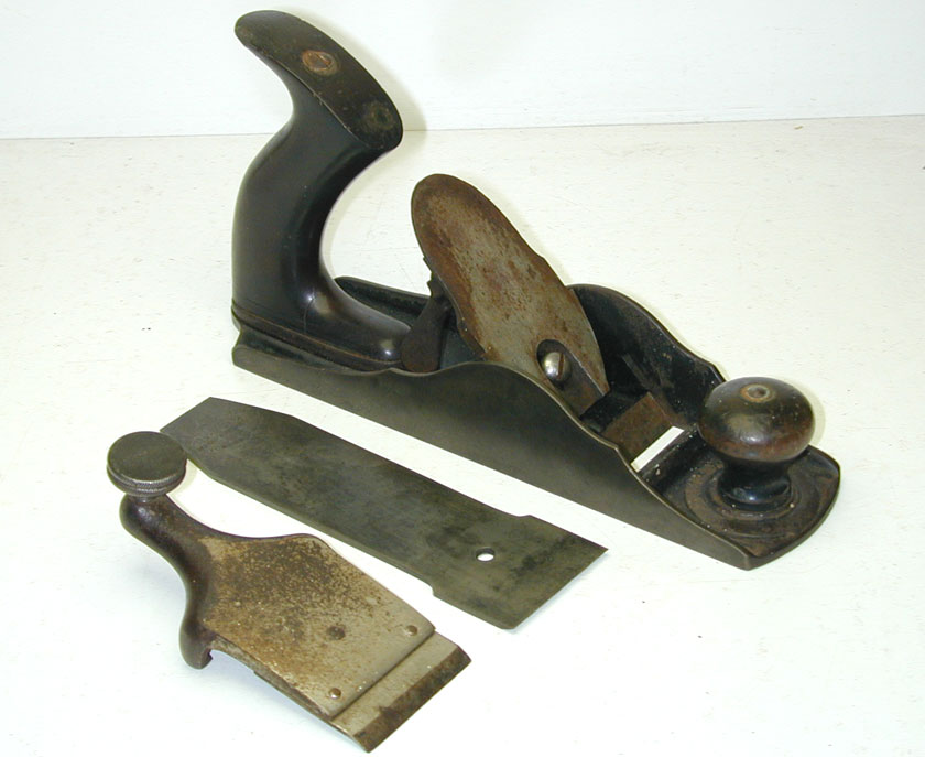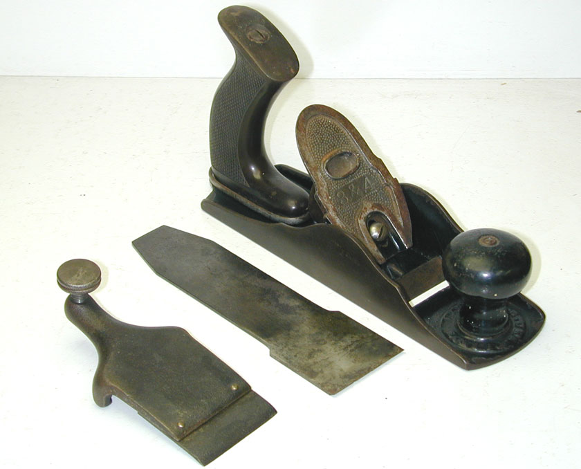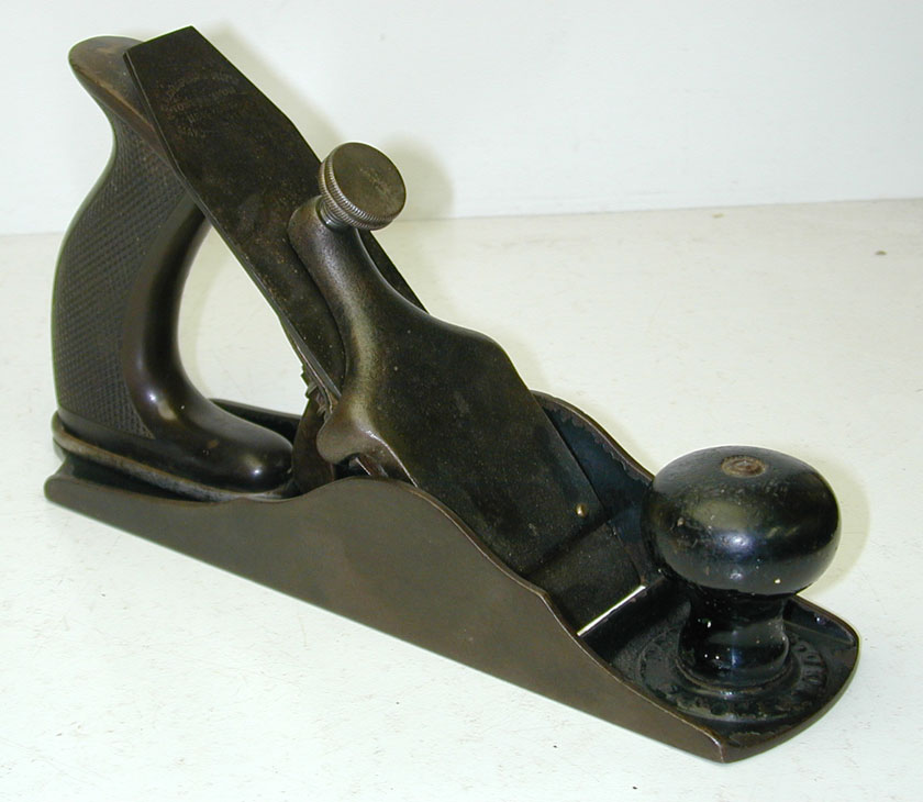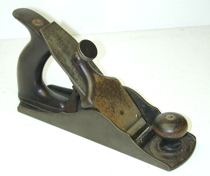 #203 This plane has a smooth rubber handle in the shape of the iron handle with a longer horn, and a small wooden knob with Chaplin's Patent machined away from the body around the knob. Blade looks like a replacement from a wooden body plane #72 or #73 and the lever has a brass rivet in the middle, fitted later.
